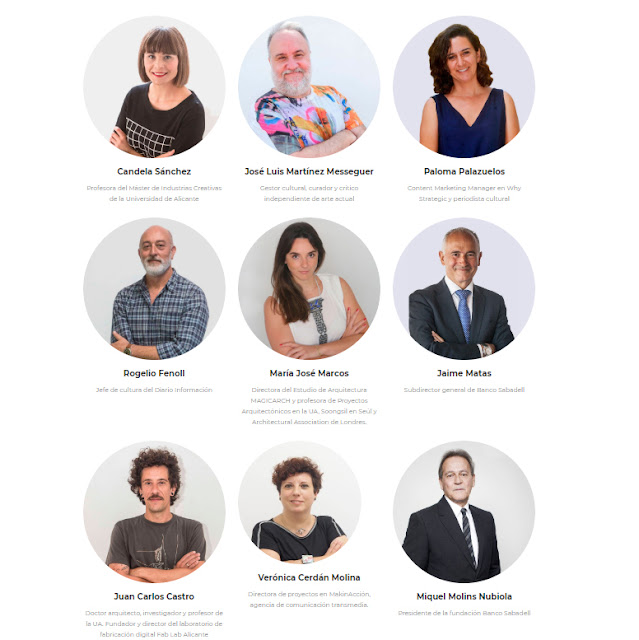 COMPOSICIÓN DE LOS OTROS EXPERTOS DEL JURADO: 'El gestor cultural, curador y crítico independiente de arte actual José Luis Martínez Meseguer, Paloma Palazuelos es periodista cultural, colaboradora del suplemento Arte & Letras, y en la actualidad es Content Marketing Manager para la agencia de acompañamiento estratégico y transformación digital tecnológica Why Strategic. Jaime Matas Vallverdú es subdirector general y director territorial este de Banco Sabadell, Juan Carlos Castro es doctor Arquitecto, investigador y profesor de la Universidad de Alicante. Fundador y director del laboratorio de fabricación digital Fab Lab Alicante. Cande Sánchez Olmos, doctora con mención Internacional por la UA y licenciada en periodismo por la Universitat Autònoma de Barcelona. El periodista Rogelio Fenoll es jefe de la sección de Cultura del diario INFORMACIÓN de Alicante desde 2010.'